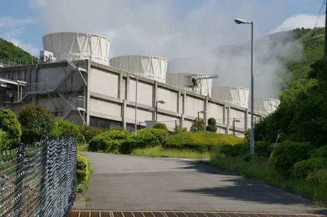 筋湯温泉の近くにある八丁原地熱発電所です。地熱を利用した発電所で、発電所からは蒸気がもくもくと上がっています。八丁原地熱発電所は日本で最大の出力がある発電所です。発電所は八丁原発電展示室があり、予約すれば見学する事ができます。