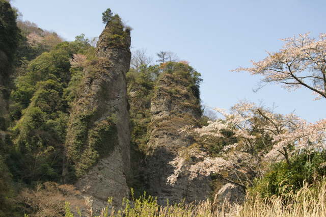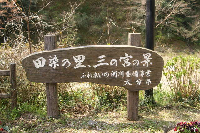 県道34号線沿いを走っていると杵築と豊後高田の県境にある田染にひと際目立つの奇峰、三の宮の景があります。ここには眺めるための駐車場、川沿いには芝生とベンチがあって小さな公園のようになっています。春になると桜、秋になると紅葉も美しくなります。歩いて7分ぐらいした所に鍋山磨崖仏がありますが駐車場がないので、見る場合はここに駐車するとよいです。