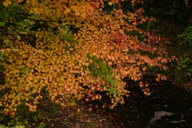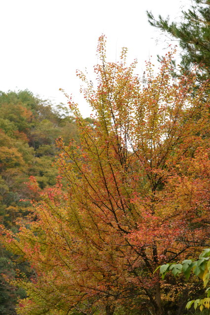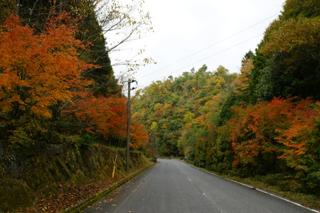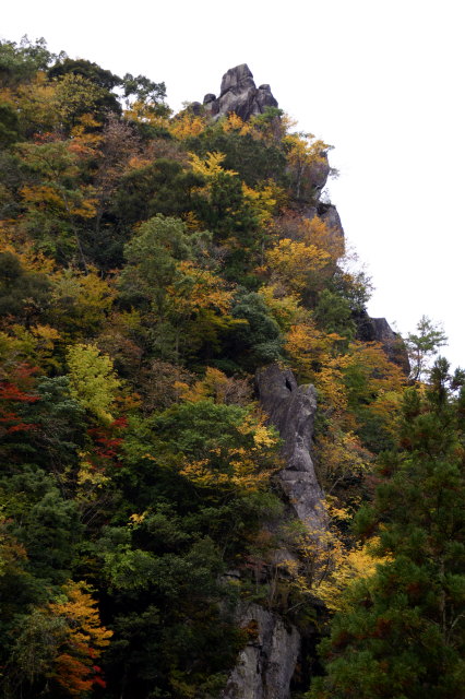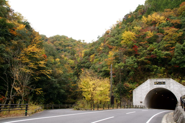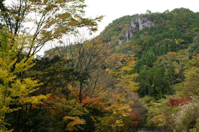 耶馬溪の紅葉の名所の一つ折戸渓谷です。紅葉の時期は道沿いの山々が赤や黄色に染まっており、紅葉の美しい所々に駐車スペースもあります。耶馬溪の紅葉は県内では早く訪れます。