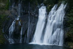 大野川の源流にある大きな岩の間から湧き出ている高さ38mの滝です。